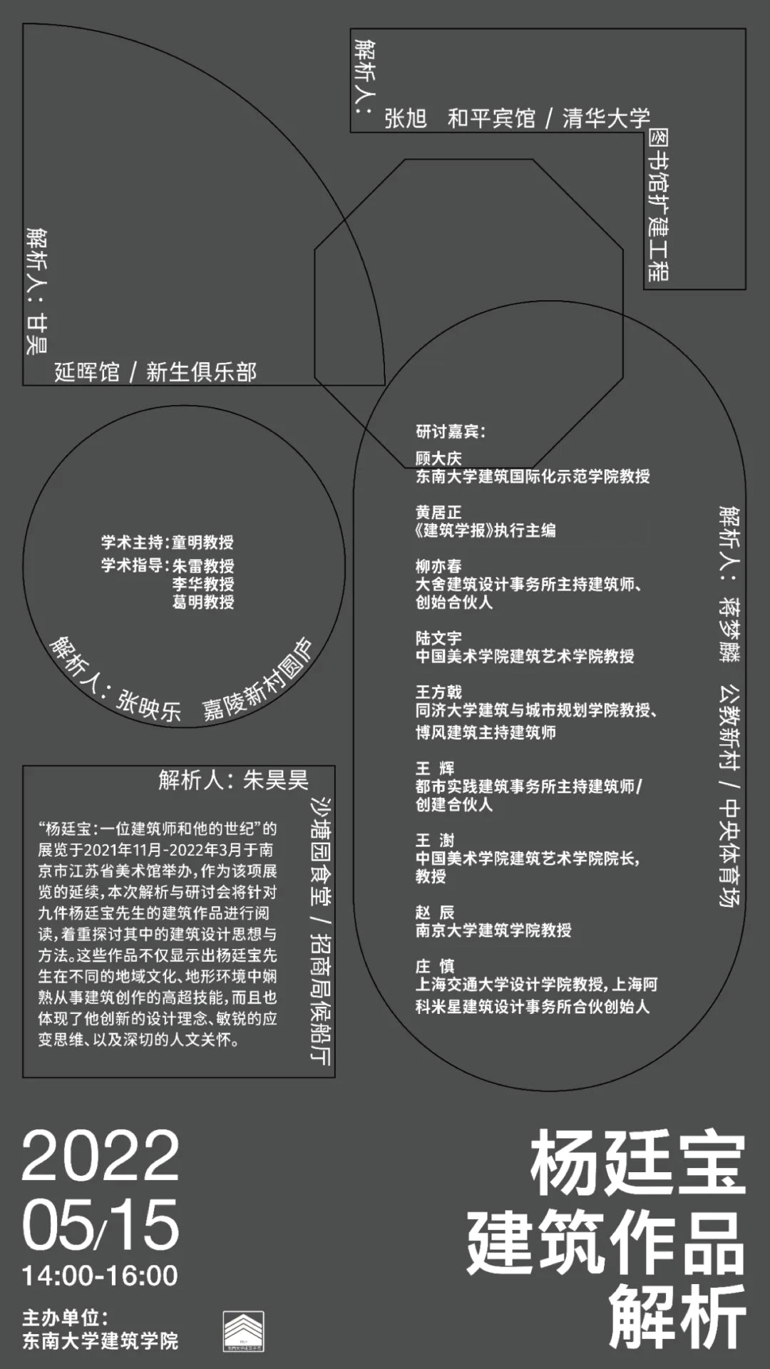 杨廷宝建筑作品解析与研讨会将针对九件建筑作品进行阅读,着重探讨其中的建筑设计思想与方法。从这些作品中可以看到,杨廷宝先生从不拘于某种形式化的固定法则,而是超越表面性的式样风格影响,时刻应对具体的场景,本着现实主义的精神投入到建筑创作中,从而使建筑实践变得活跃和生动,所形成的建筑作品也就更加纯正而经典。