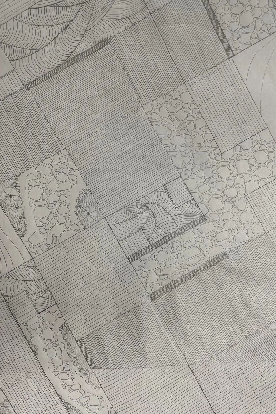 在与模型相同尺寸的拷贝纸上徒手绘制图纸。基于立体模型,在图纸中对于自然景观、交通连接、城市家具等元素进行深化设计。图纸分为两部分,一半绘制5-8m截平面,另一半绘制总平面,兼顾对室内外空间关系与“游乐场”整体形态的表达。