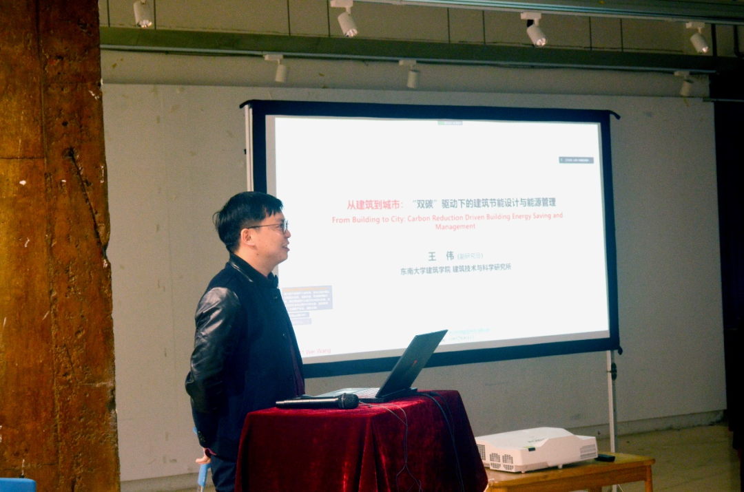 本次分享的主题为“从建筑到城市:‘双碳’驱动下的建筑节能设计与能源管理”。王伟老师从以下三个方向分享,其一自我介绍,其二介绍作为能环背景的学生,在建筑学院工作如何适应建筑学的知识体系与研究方向,其三个人的研究心得。