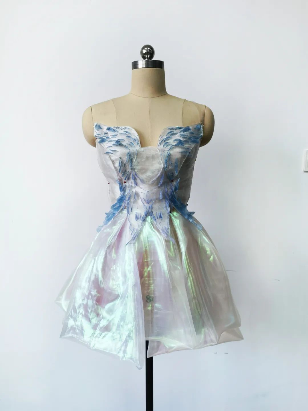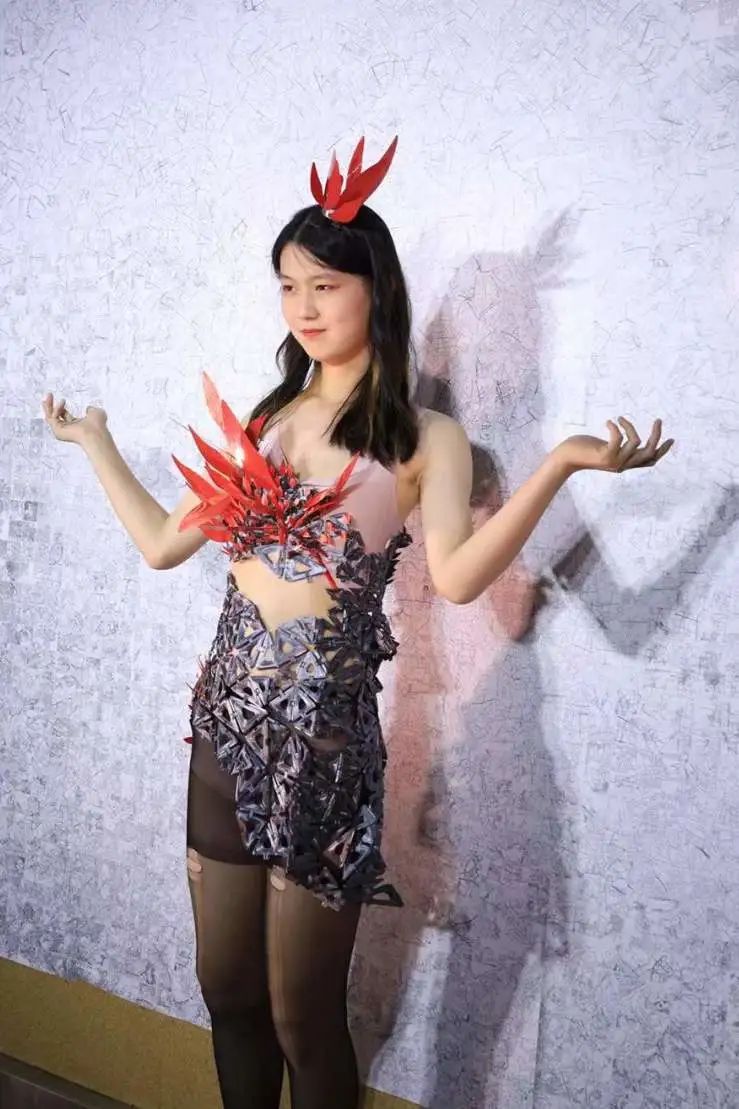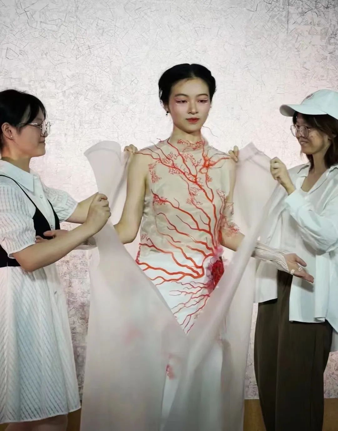 通过立体剪裁,五片板片形成版型,侧片用于版型收缩。将血管纹路打印于其上,透明纱片与非透明布料缠绕结合,达到突出血管纹路同时包庇身体。