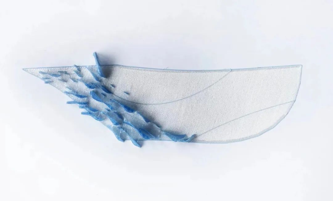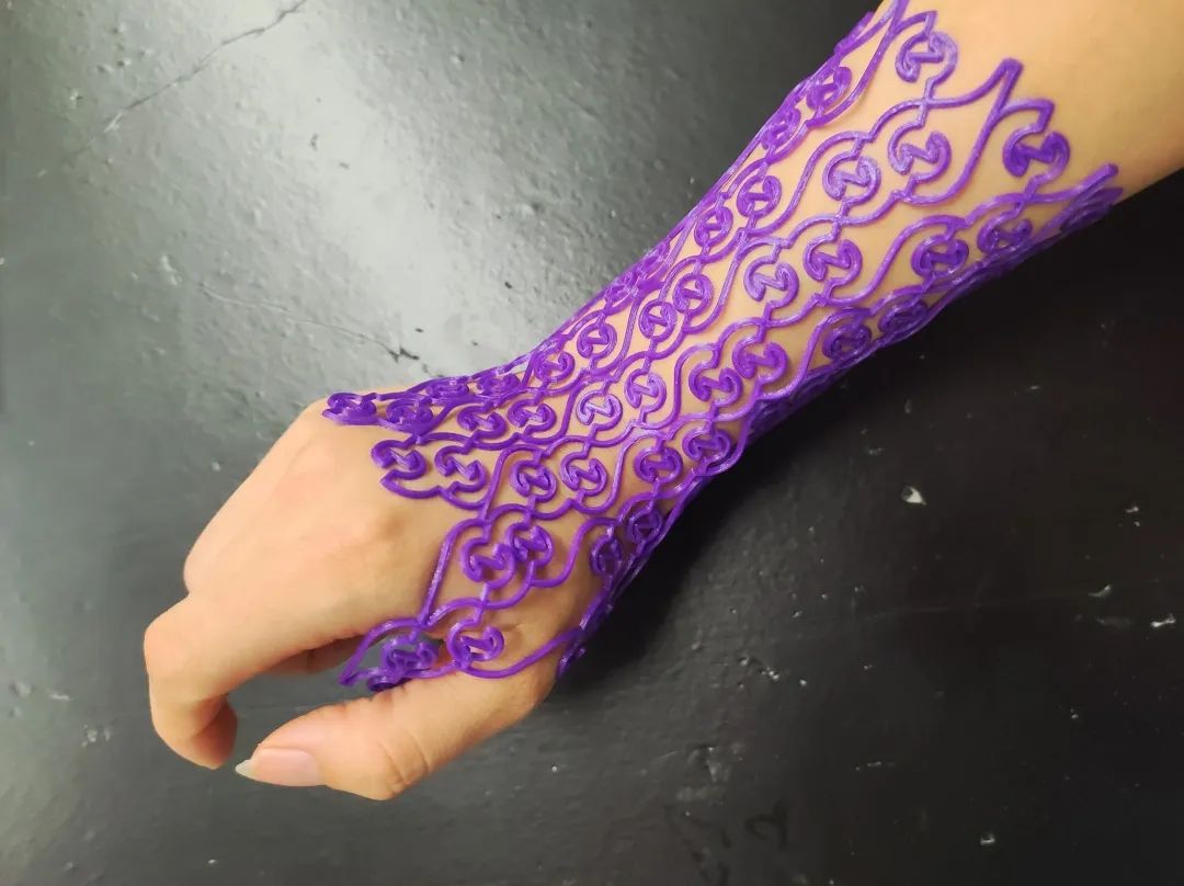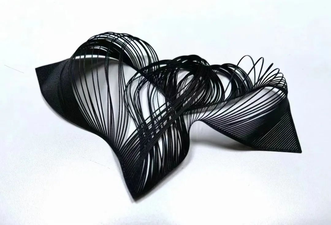 FDM工艺还支持打印TPU、TPE等柔性材料,这类材料触感柔软,像布一样能清洗和熨烫,适合作为时装织物的制作材料。传统织物的定制与制造过程需要较长周期,裁剪也有一定损耗。而柔性材料一体打印的定制面料通过控制打印路径可以调整织物纹理,精确控制织物形状,从设计到板片打印一步到位。