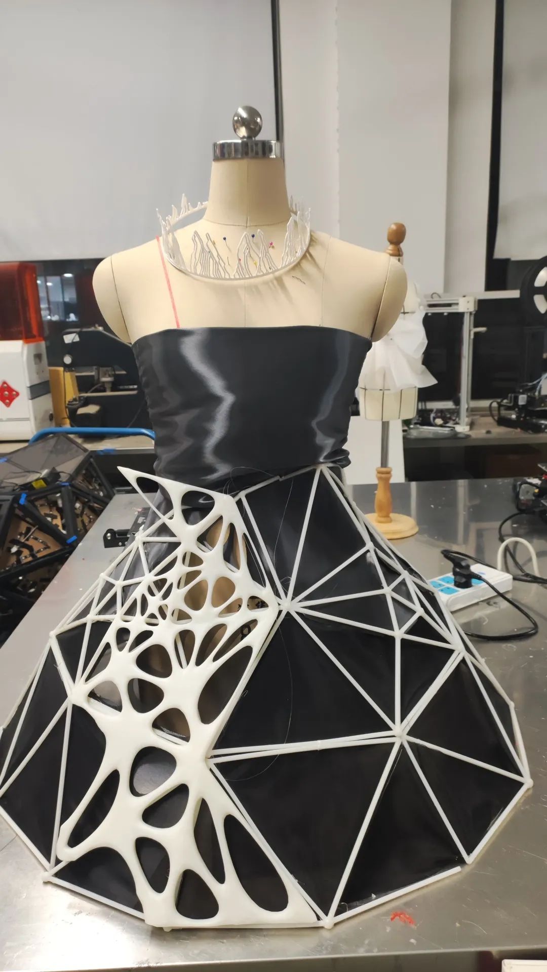 本次工作营以3D打印服装为主要媒介,重点研究定制化的3D打印工艺,令织物与多种材料有效结合形成自成型等复杂机制,对3D打印织物的质感、性能、外观进行数字化调节,由定制化的工艺出发进行服装设计创新。