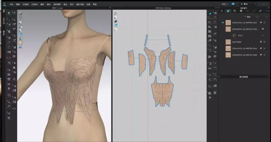 服装板片划分是长久以来经验和科学的总结,一件时装的定制要经历制版-打样-复核-修改的过程保证穿着效果。借助于参数化软件,我们可以采用精密的数字模拟替代这个传统过程:数字化划分板片,模拟缝纫和工艺效果,直到获得理想状态。许多建模软件都有布料解算的模拟算法,如Blender、Houdini、Maya等。但模拟成衣需要配合虚拟模特的姿势文件,涉及到模型骨骼配合,本工作营采用了以布料模拟见长的CLO3D。