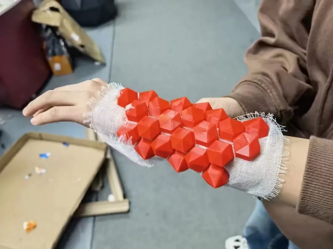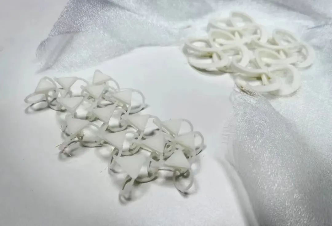 相比减材制造的繁琐,增材制造可以绕过切削、开口等步骤直接打印出自锁结构,这是3D打印织物区别于传统面料的一个重要特点。运用刚性互锁构件,令硬质单元也能具备布料的灵活性,同时支持定制,替换部分构件。