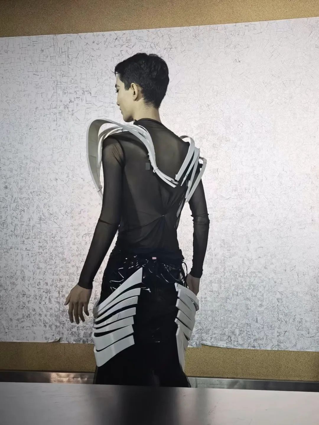 本服装重塑了男性身体的视觉结构,放弃了传统的“上衣、下装”的思路而采取身体包裹-构件隐喻的层次,结合半透明纱网与带有强烈束缚色彩的3D打印构件叠加,形成反直觉但又映射日常生活的男性形象。
