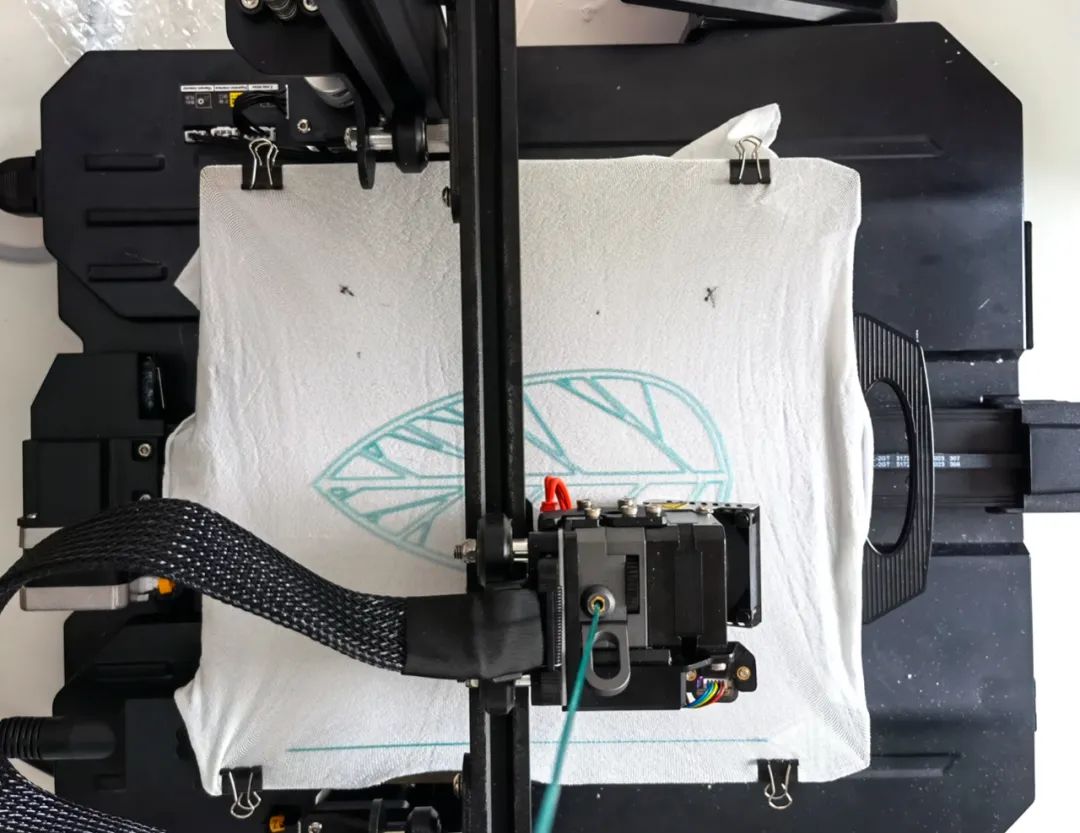 为了让织物更加紧密的结合材料,可以预先打印一层材料,再覆盖面料继续打印,材料则穿过织物的孔洞空隙与下层材料融合。