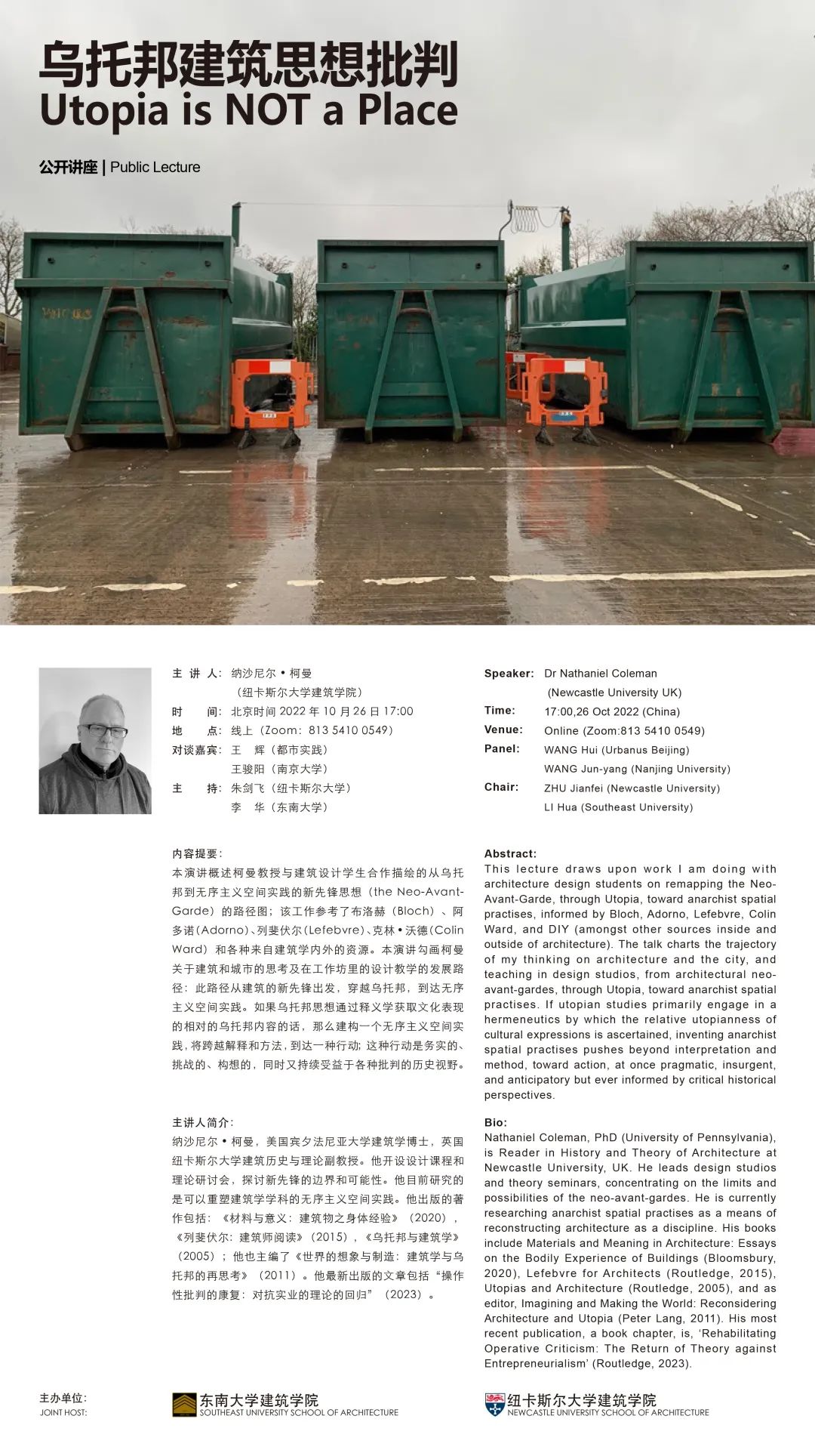 本演讲概述柯曼教授与建筑设计学生合作描绘的从乌托邦到无序主义空间实践的新先锋思想(the Neo-Avant-Garde)的路径图;该工作参考了布洛赫(Bloch)、阿多诺(Adorno)、列斐伏尔(Lefebvre)、克林·沃德(Colin Ward)和各种来自建筑学内外的资源。本演讲勾画柯曼关于建筑和城市的思考及在工作坊里的设计教学的发展路径:此路径从建筑的新先锋出发,穿越乌托邦,到达无序主义空间实践。如果乌托邦思想通过释义学获取文化表现的相对的乌托邦内容的话,那么建构一个无序主义空间实践,将跨越解释和方法,到达一种行动;这种行动是务实的、挑战的、构想的,同时又持续受益于各种批判的历史视野。