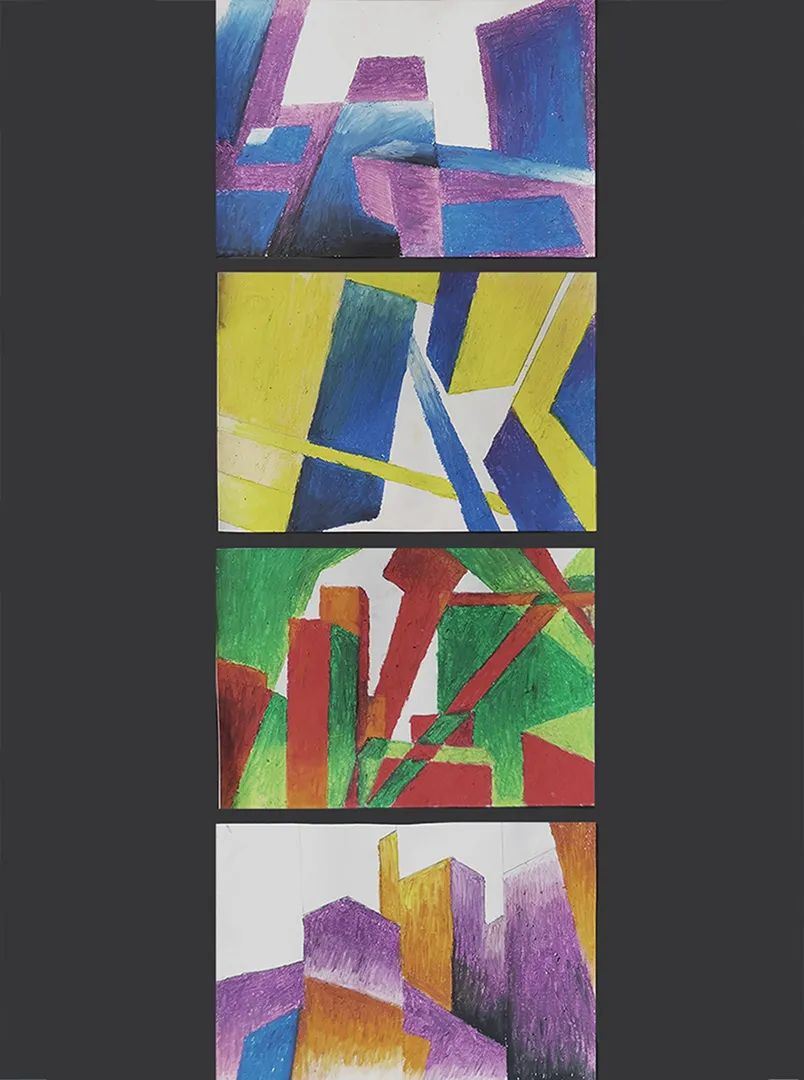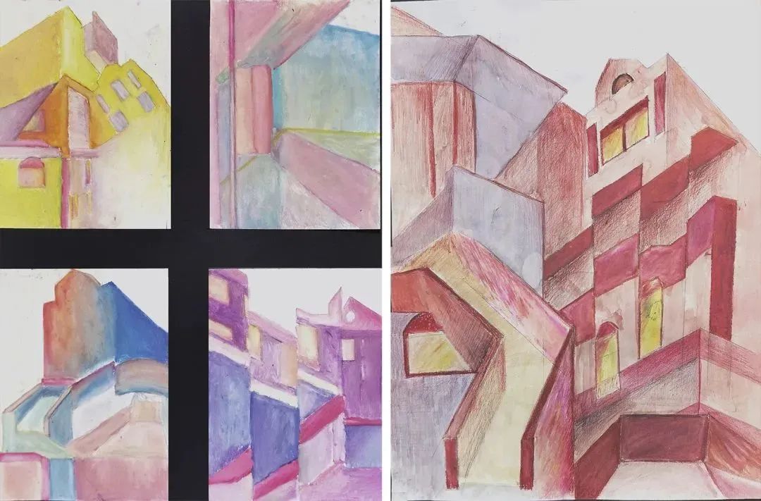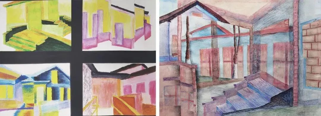 4)将同一个建筑的不同角度进行拼贴、组合,形成共时性再现并尝试运用多种工具完成绘制