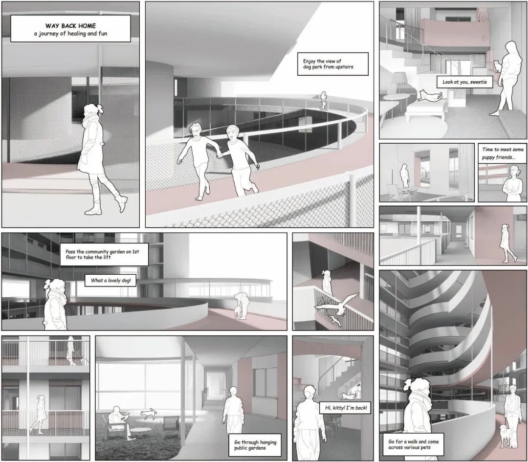 方案设计:现有的住区设计对于养宠人群来说有诸多不友好之处,包括公共空间缺乏人宠关系的考量进而导致邻里关系冲突、户型缺少对宠物的友好设计等等。在这个设计中,彭同学和程同学通过“方”和“圆”的要素来协调处理人与动物、私密空间与公共空间、服务空间与被服务空间的关系,从而塑造出一个注重交流、强调全天候、宠物友好的住区综合体。户型包括犬之家、鸟之家和猫之家三种类型,根据不同的人和动物共处需求而展开相应的户型定制化设计。公共的全天候遛狗环道由悬吊结构完成,尽显自由与变化。