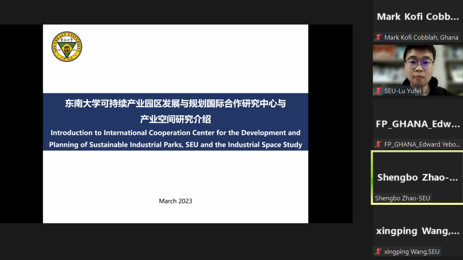 中国-加纳经济特区和工业园区发展知识分享和经验交流会于北京时间4月3日16:30线上举行,会议由联合国南南合作办公室城市项目小组顾问穆景川先生主持,参会代表包括加纳科学和工业研究理事会(CSIR),加纳环境、科学、技术和创新部(MESTI),加纳自由贸易区管理局(GFZA),阿克拉大都会议会(AMA),加纳数码中心有限公司通信与数字化部,加纳性别、儿童和社会保障部的相关人员,以及中心主任王兴平和高级研究助理赵胜波、许闻博、卢宇飞等。首先,CSIR副主任Marian D. Quain教授对加纳工业与工业园区的发展现状、加纳工业园区发展计划的编制与实施等情况进行了详细介绍,并指出希望能学习中国在发展工业园区方面的先进经验。随后,中心高级研究助理卢宇飞为参会者播放了苏州工业园区和南京开发区宣传影片,以期让加纳方更清晰、更直观地了解中国园区发展的实际情况。接着,中心高级研究助理赵胜波和许闻博分别对中心主要承担的工作与合作情况,以及中国开发区、高新区和农业园区在发展与规划方面的具体做法进行了介绍。最后,中心主任王兴平教授对未来中加双方可能开展的合作事项进行了展望,包括开展园区规划合作、国际培训、科研合作与高等教育合作等。本次会议为团队在非洲国家开展园区发展与规划领域的合作提供了新的渠道。