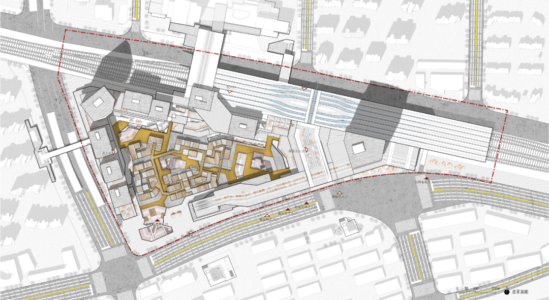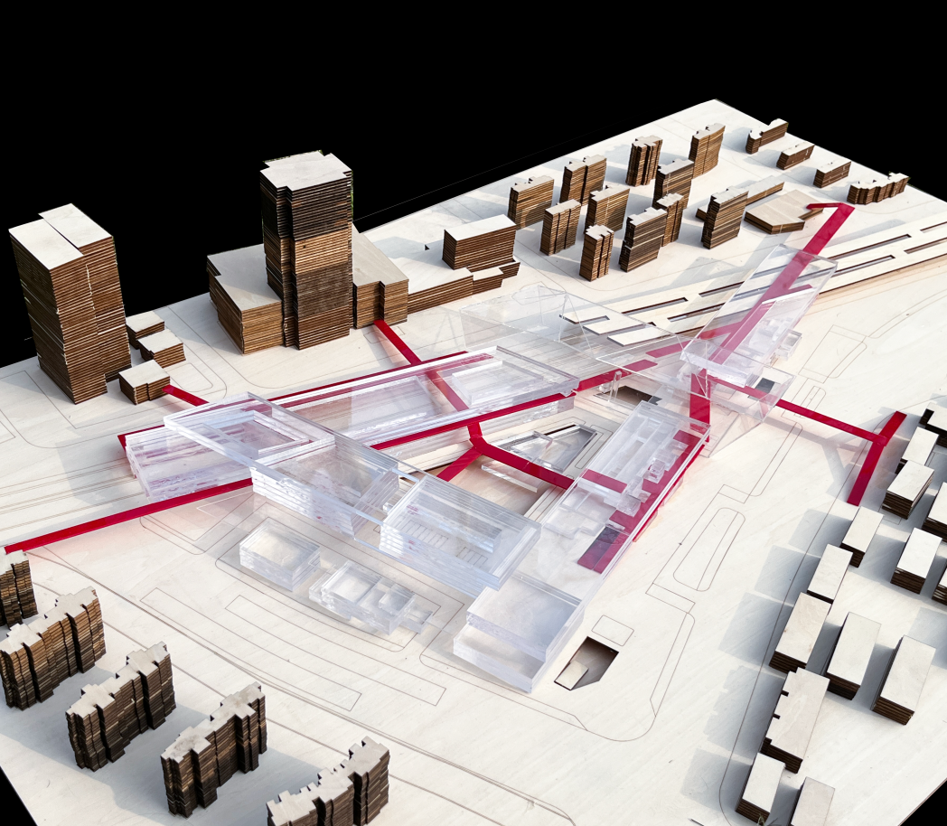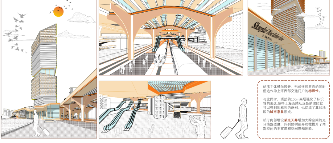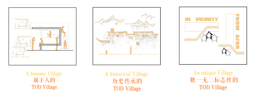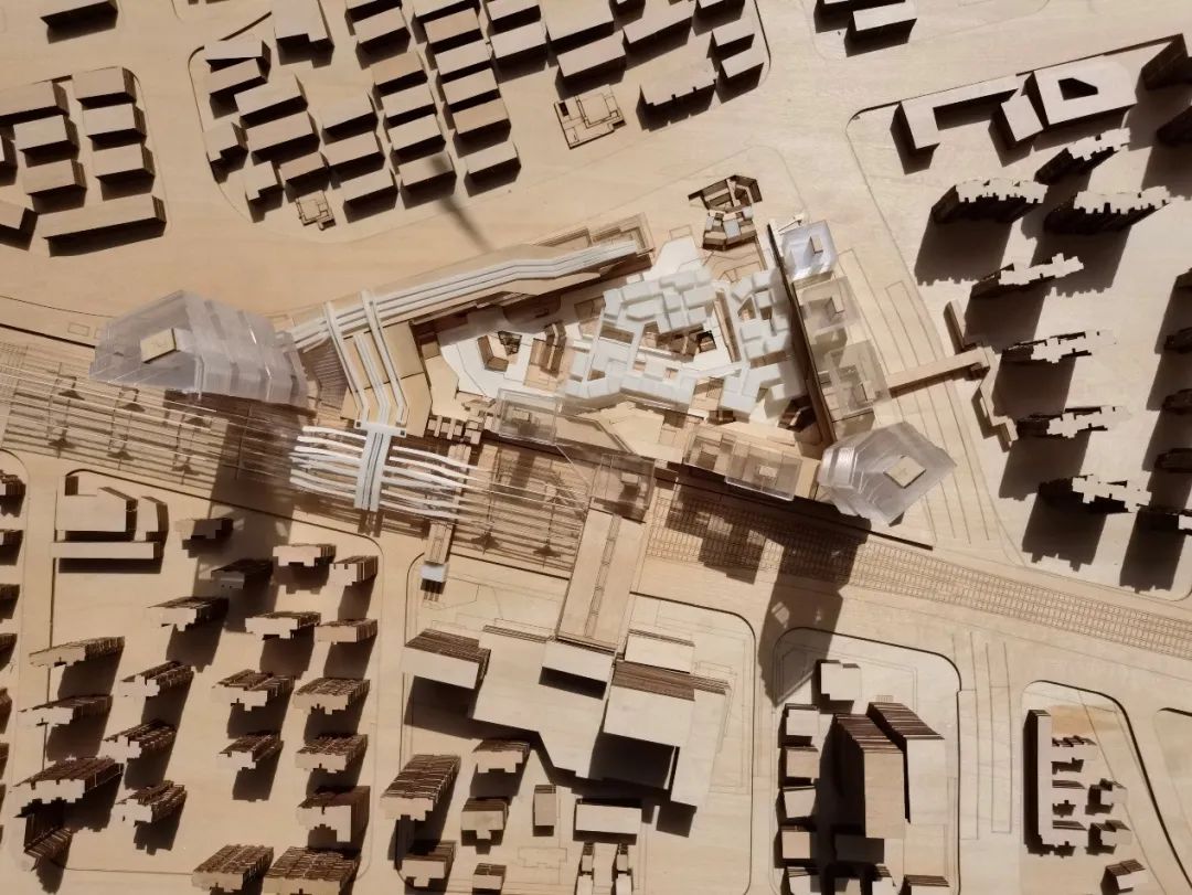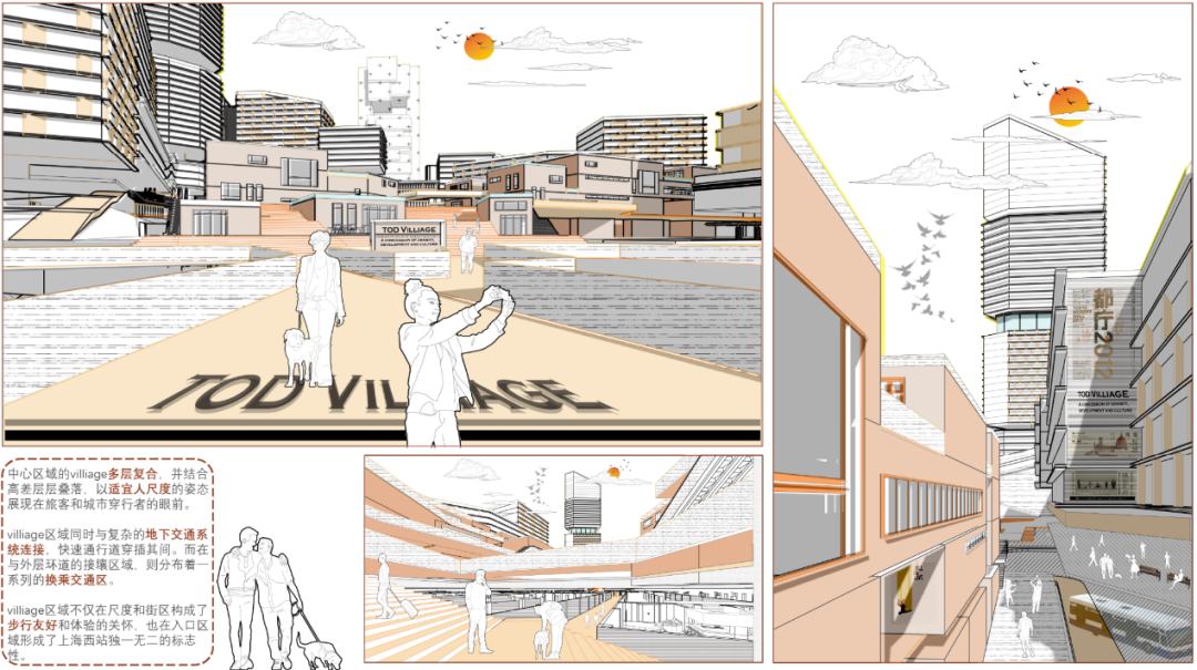 杨健文 丁瑜设计说明:TOD开发模式在带来巨大城市化动力和经济效益的同时也带来了超大尺度对于文脉与城市肌理的割裂。同时,这样经济导向性极其明确的状态下很容易造成同质化TOD开发的典型问题。在此次设计当中,我们在考虑多方主体(旅客,通勤者,社区居民)的情况之下,汲取TOD开发模式的核心要素和交通组织方式,并针对TOD开发模式自身的固有弊病,结合真如本地的文脉肌理,希望能够打造一方独属于真如区域的地标性TOD。我们希望将高强度开发的土地利用下快节奏的换乘系统与尺度宜人,慢节奏的城市公共活动空间相结合,同时形式上给予真如本地城市肌理的形式与尺度最大化的尊重,得到一个城市不同人群能够共享的,充满活力的TOD Village。概念意象: