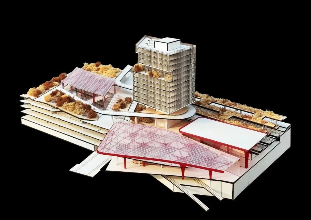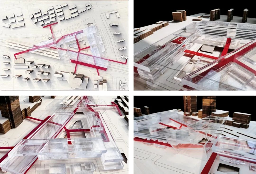 郭欣睿 李泽瑞设计说明:针对场地中人与城市(南北割裂,场站识别性差),人与建筑(空间识别性差,换乘效率低),人与人(关联性弱,缺少互动和视线交流)三大问题,设计提出以三维空间为切入点,创造视廊TUBE,提升使用者的换乘、休闲、购物、办公等体验,视廊TUBE作为城市取景器,可通过建立可见直达TUBE慢行体系,提升各换乘方式的便利性,并在各“TUBE”之间创造更多的视线交流机会,丰富空间体验,提高新建TOD综合体的共享性、高效性和活力。概念模型: