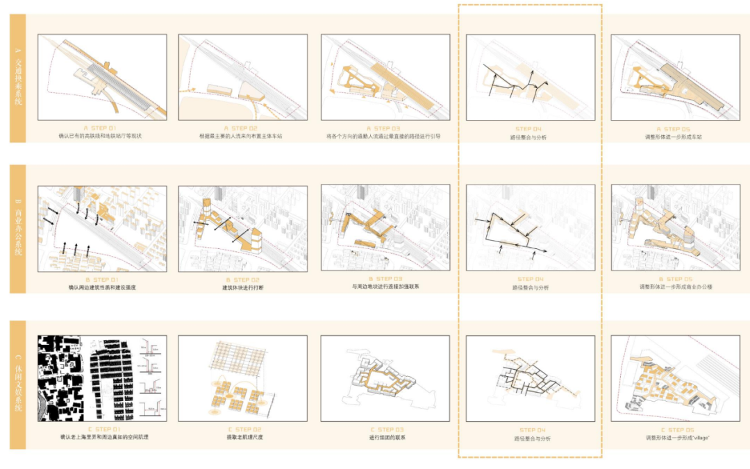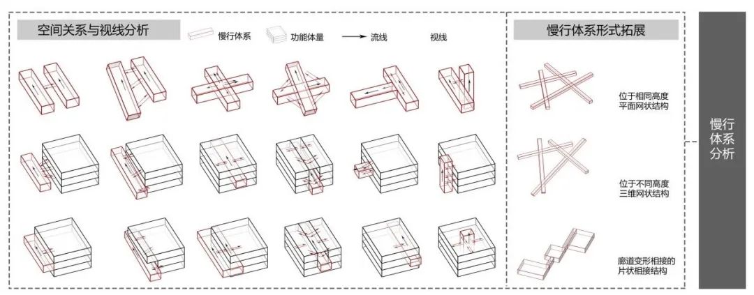 方案分析:设计前期通过分析主要交通方式、场地内外人流聚集点之间的视线、流线关系,构建出空间概念模型,其中视线和流线重合的部分即为“可见直达TUBE”。依据概念模型,设计归纳出慢行体系彼此之间可能存在的六种基本形态,并演化出慢行体系与功能体量的多种空间形式。