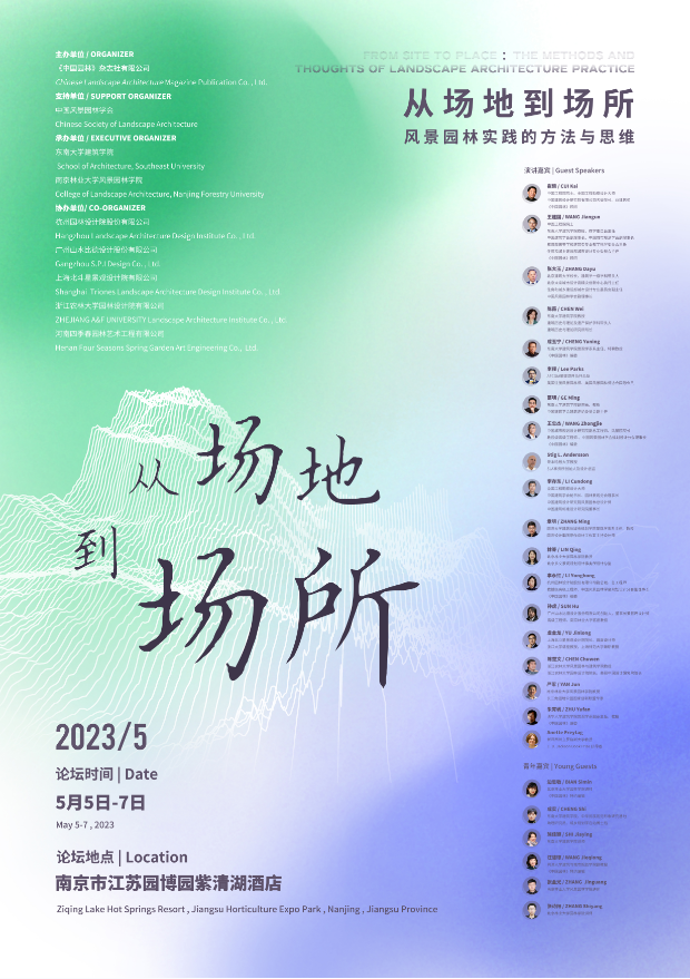 2023年5月5-7日,2023风景园林行业发展论坛暨“从场地到场所——风景园林实践的方法与思维”研讨会在南京成功举办,共有来自国内外50余所高校、科研机构与企事业单位的200余名风景园林行业领导、专家学者及师生代表参会。论坛由《中国园林》杂志社有限公司主办,中国风景园林学会支持,、南京林业大学风景园林学院承办,杭州园林设计院股份有限公司等5家单位协办,会议由人民网、新华社江苏分社、江苏卫视、南京电视台等新闻媒体进行宣传报道。