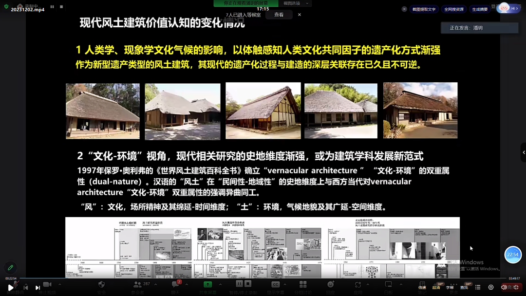 同济大学建筑与城市规划学院潘玥副教授首先分享《风土建筑的保护与再生:建造行为与遗产价值认知相互作用之诠释》,以日本为例分析风土建筑在现代涌现的大量保护和再生现象,对传统木构自殖式体系中的建造行为进行批判性审视,及其与遗产价值认知的相互作用与呈现效果,以促进风土建筑多元存续方式的探索和思考。
