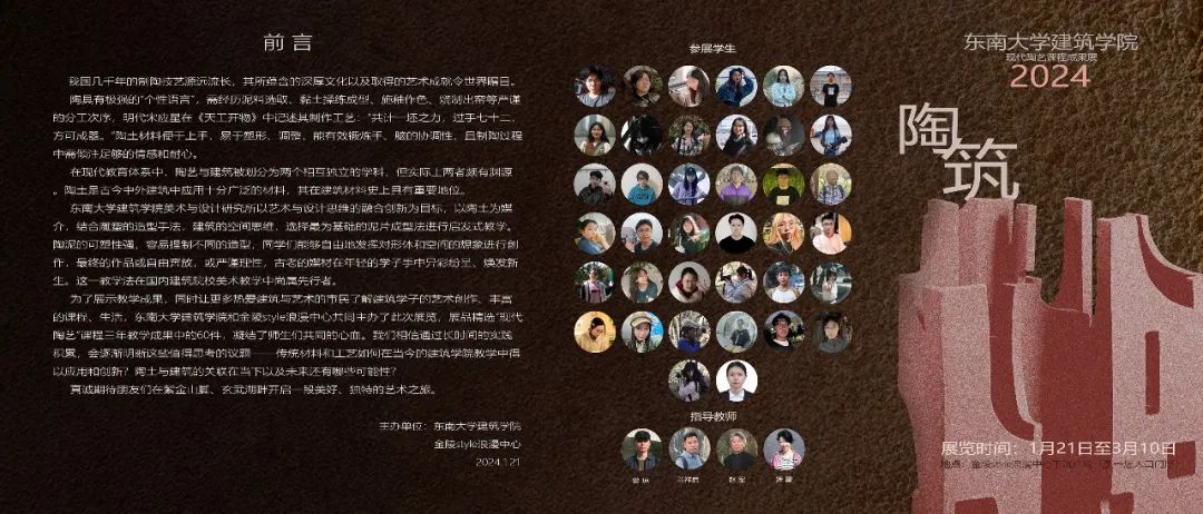 本次展览精选了建筑学院“现代陶艺”课程近三年教学中的60件作品,凝结了师生们共同的心血,既是教学成果的展示,也是面向热爱建筑与艺术的市民朋友们的艺术普及教育活动。陶土材料便于上手,易于塑形、调整,能有效锻炼手和脑的灵活性。在现代教育体系中,陶艺与建筑被划分为两个相互独立的学科,但实际上陶是古今中外建筑中应用十分广泛的材料,其在建筑材料史上也具有重要地位。