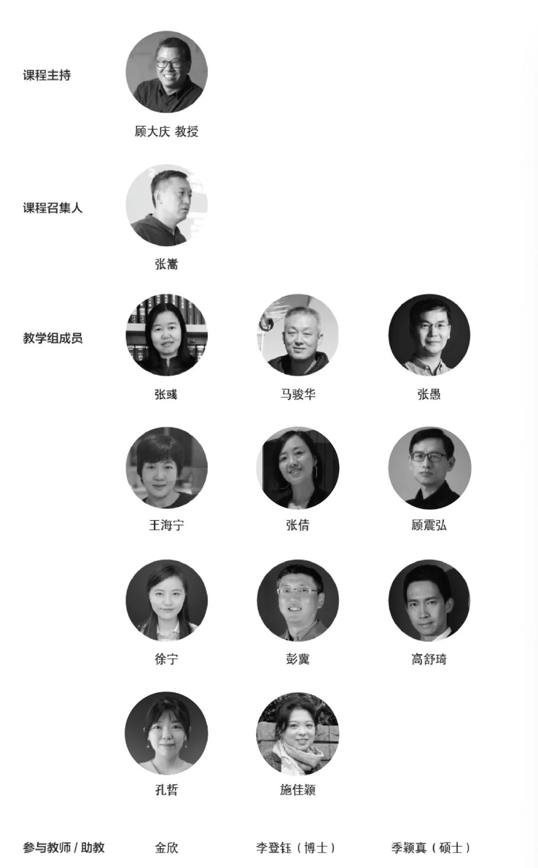 设计基础I-“现实城市”教学团队由课程主持教授、授课教师和研究生助教共同构成。课程主持为顾大庆教授。教学团队由建筑学院各共十余位教师组成,授课教师有着不同的年龄层次、学术背景和研究方向,在各自的领域有所专长。各课题教案由负责老师制定,并组织全体教师与助教集体备课、试做,确定教案具体内容。学期中定期举行教学研讨,根据学生反馈和作业成果,调整教学内容和进度安排。