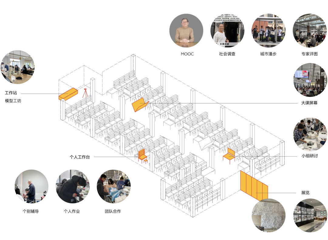 2.设计大课堂:线下教学主要场所针对师生线下面对面研讨和学生自主操作为主的“设计工作室”教学形态,全年级师生统一在专业设计教室中完成。学生拥有独立工位,并配置小组研讨空间。该教学环境包含大课讲堂,小组一对一辅导等主要线下教学活动。