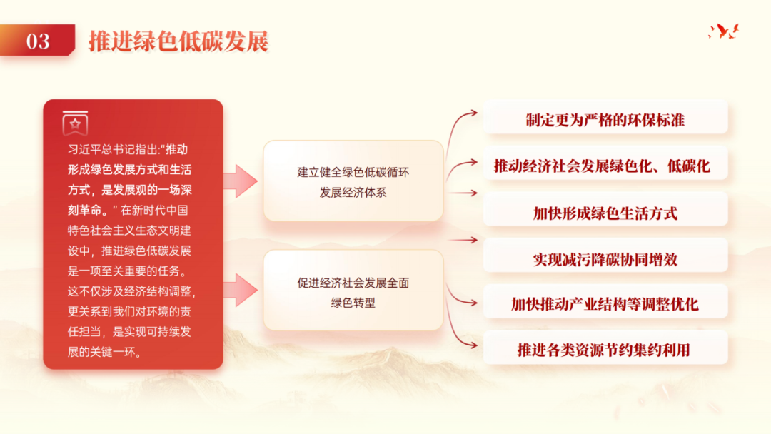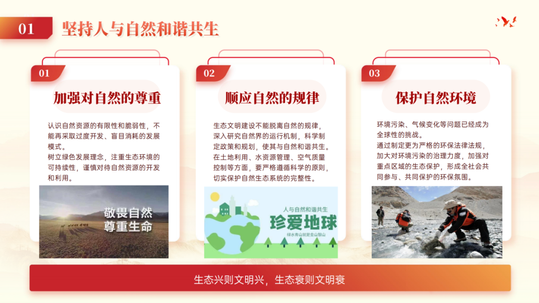 首先,王菡怿同志向我们介绍了“建设美丽中国”的具体理论内容。党课生动地展示了“坚持人与自然和谐共生”、“绿水青山就是金山银山”、“推进绿色低碳发展”、“统筹山水林田湖草沙系统治理”、“实行最严格的生态环境保护制度”以及“共建地球生命共同体”六大理论内容,并用视频等方式帮助支部成员理解其中具体理念与解决方法。
