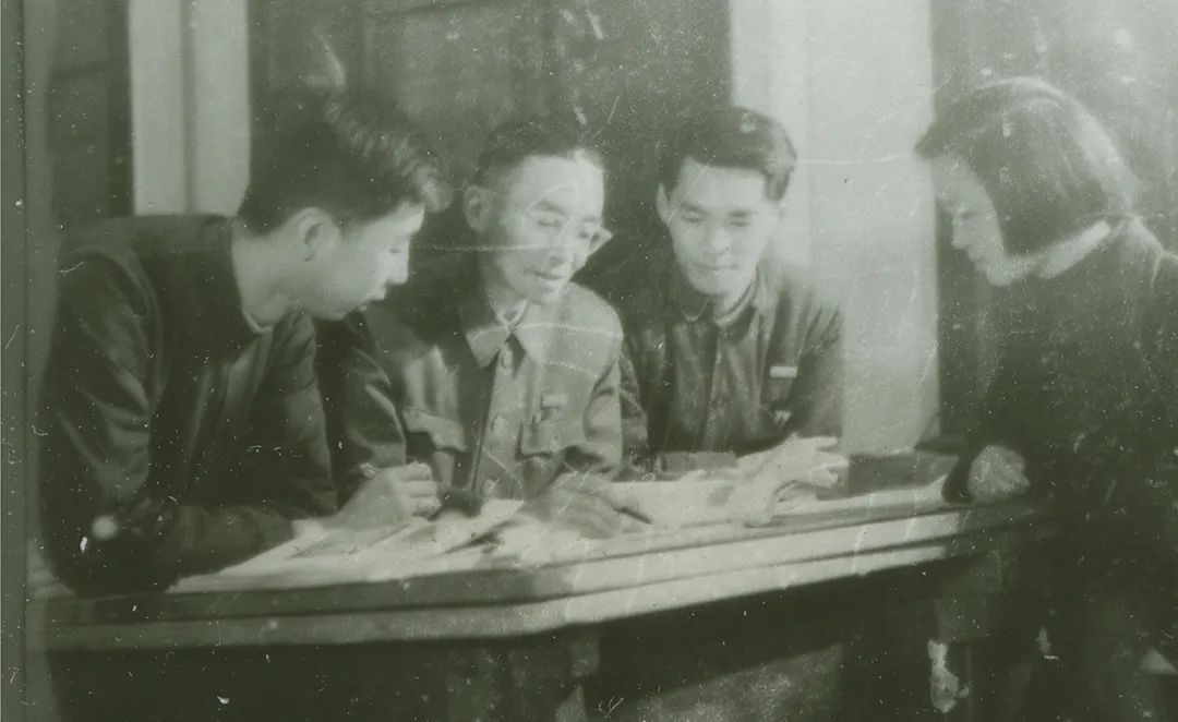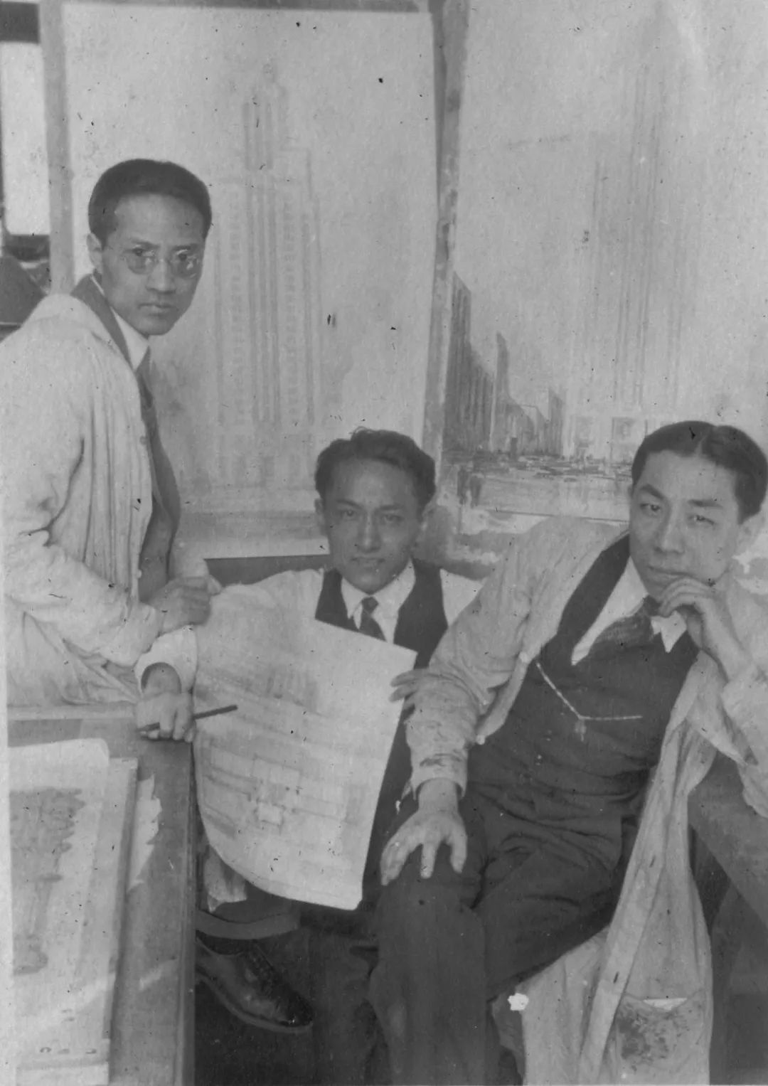 杨廷宝(左二)、赵深(左三)、范文照(右二)与朱彬(右一)在设计教室