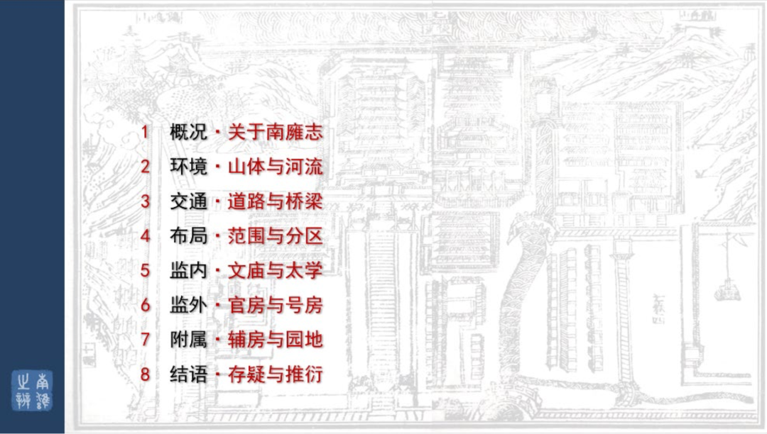 明南都太学建于朱元璋吴元年(1366年),明定都金陵后的洪武元年(1368年)改为国子学,校舍均沿用元集庆路学。洪武十五年(1382年)改建于鸡笼(现北极阁)山之阳并更名国子监。永乐元年(1402年)设北京国子监后志名“南㢕”,以别于北京之称。其专志《南㢕志》成于嘉靖二十三年(1545年)。全志共8册、24卷,分:事纪、官职 表、规制考、谟训考、礼仪考、音乐考、储养考、经籍考、列传9部分。其中第五册卷七、 第六册卷八为“规制考”的上、下二篇就国子监的校园及建筑进行全面阐述。本寻踪共分8个章节,通过《南㢕志》中校园规划建设相关信息的矢量化分析与研究, 尽可能真实地再现国子监盛期的整体风貌,及其与东大四牌楼校园及周边区域的空间关联。