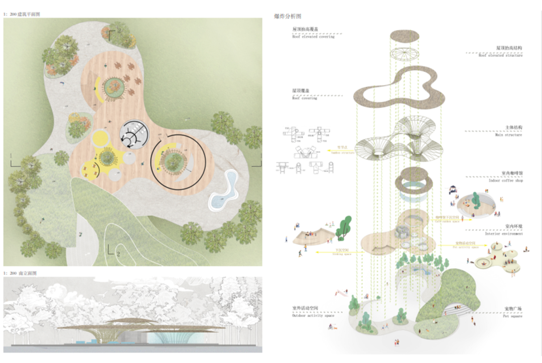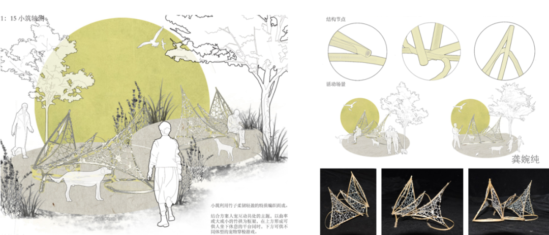 龚婉纯同学将童年爱宠的梦想与公园日常使用的多元体验场景结合塑造了一个社区人宠互动活力公园。用合理分区、地形改造与流线组织化解爱宠人群与惧宠人群的矛盾,用亲切的竹材和自然形态让游客体验自然和多样的玩法。柔性竹材的结构体系推敲不易,感兴趣未来可以继续。