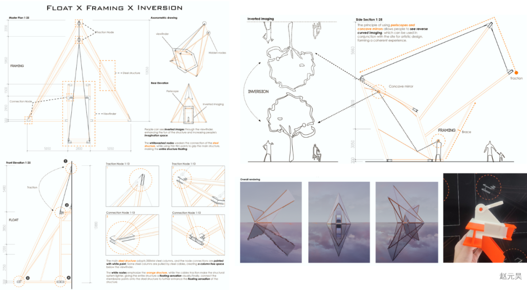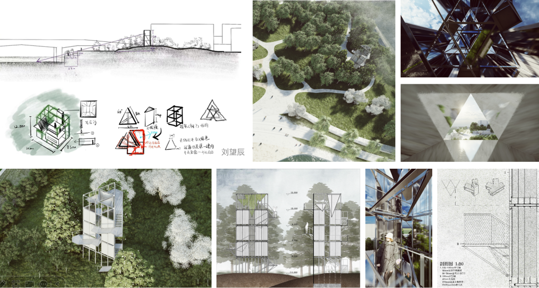 这个小练习,让同学们脑洞大开,每个人都以自己独特的视角在小组共同完成的场地设计中选择了不同的位置设计景观构筑物,采用不同的功能、形态、结构、材料和环境互动,并深化到节点大样。刘望辰同学以万花筒为原型,在场地原地形改造的小丘顶上,用镜面不锈钢通过三棱镜原理做了一个眺望塔,既可眺望周边,也成为被望的焦点。