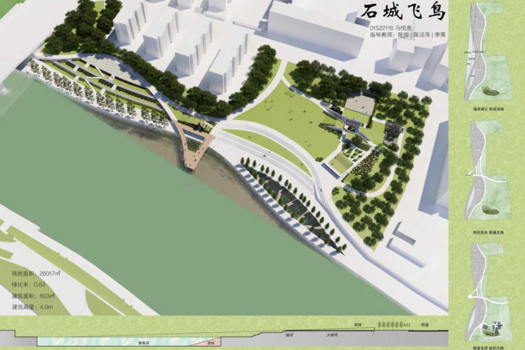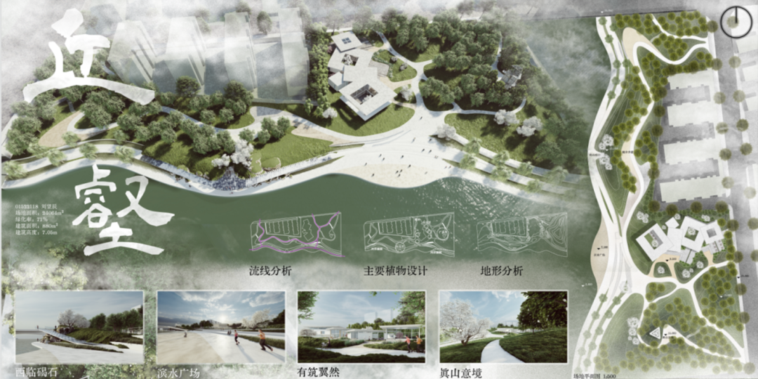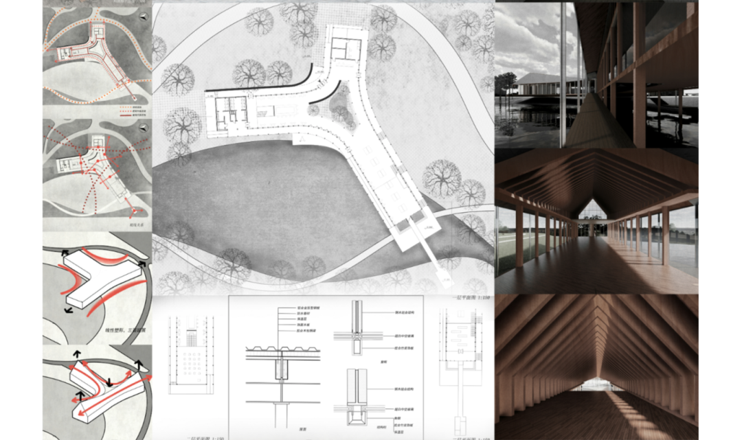 杨茹惠同学的设计亮点在于将建筑体量抬起,联通公园内部与水景,释放地面,形成积极的半室外空间,供人们活动。若建筑下方空间与堤坝有更自然衔接则会更加出彩。