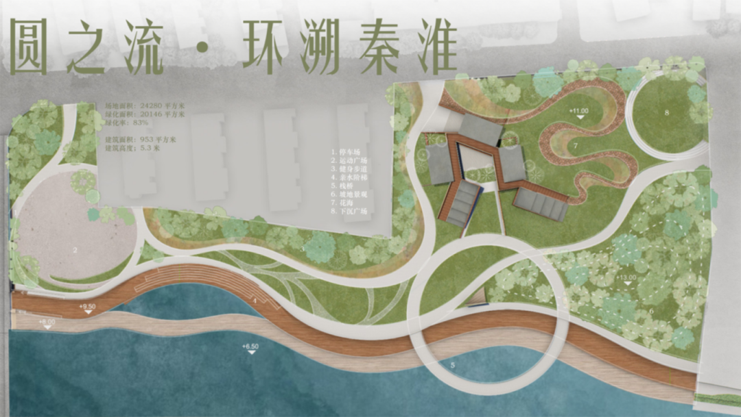 通过场地调研,同学们总结了场地具有位于秦淮河风光带的区位优势、文化底蕴强、人群活动丰富、微地形环境绿化茂盛的优势;但也有交通流线混乱、岸线生硬、景观空间利用不充分的问题,面对秦淮河水位波动的威胁,结合防洪规范提出适度改造防洪堤柔化水岸,激活水边活动的场地设计策略,并为景观建筑衔接城市街道与滨水空间,留出布局空间。