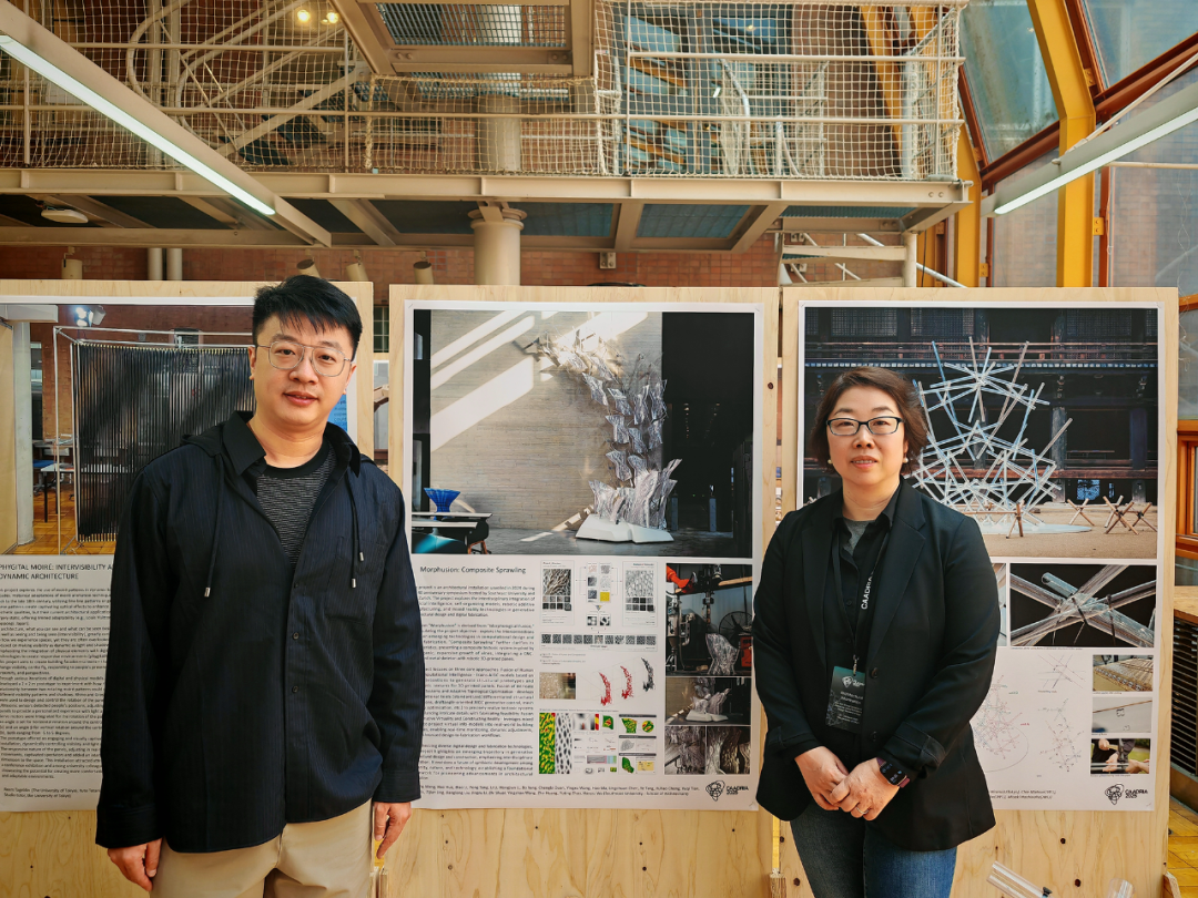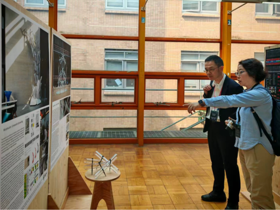 论文宣读建筑运算与应用实验室博士后研究员王大嵩主持设计,多名硕士研究生和本科生参与完成的 “形态融合·复合蔓生”项目入选并参展。该项目于2024年在东南大学与苏黎世联邦理工学院联合举办的40周年学术研讨会上正式发布,围绕人类与运算智能的融合、复杂建构体系与自适应拓扑优化的融合、信息化虚拟与实体建造的融合三项核心方法展开。该项目通过整合多种数字设计与建造技术,深入探讨了人工智能、自组织模型、机器人增材制造以及混合现实技术在生成式建筑设计与数字化建造中的跨学科融合与应用。