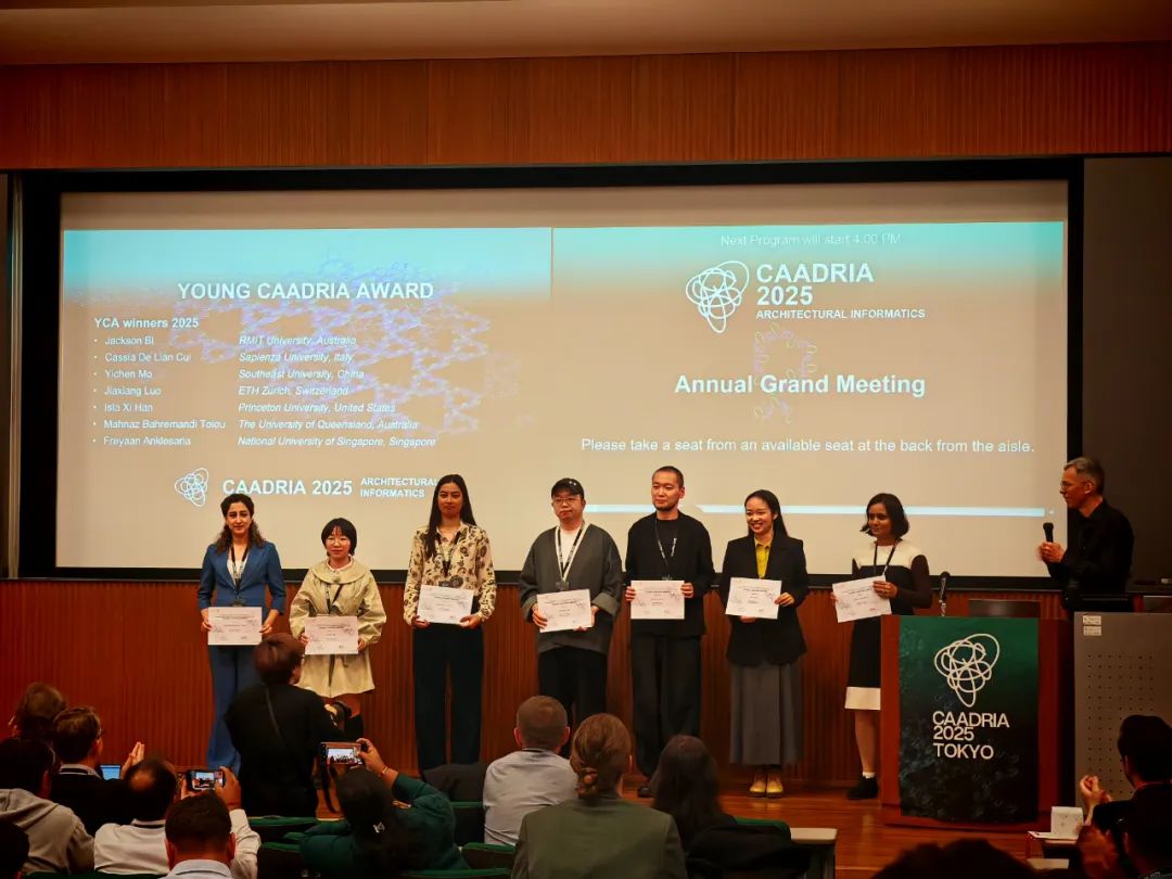 会议于3月28日闭幕。闭幕式上揭晓了本年度Young CAADRIA Award的获奖者(全部共7人),建筑运算与应用实验室博士研究生莫怡晨获奖,成为本届该奖项中唯一一位来自中国高校的获奖者。这也是继博士研究生张柏洲在CAADRIA 2024,徐佳楠在CAADRIA 2019,华好在CAADRIA2011获奖以来建筑运算与应用实验室第四次获得该奖项,显示了团队持续的成果产出及在国际上的认可度。