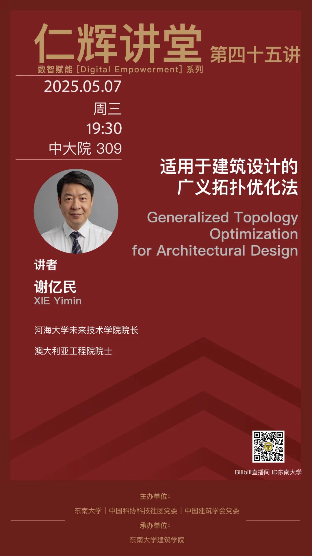 杨廷宝先生,字仁辉,是我国著名建筑学家和建筑教育家,东南大学建筑学科创立的一代宗师。2021年杨廷宝先生诞辰120周年之际,为传承和光扬先生的学术精神,开设“”,长期延请国内外著名学者、建筑师举办讲座,弘扬学术,激励后学,推动中国建筑和建筑教育事业的蓬勃发展。一直以来,建筑学学科在新技术的影响下不断发展。尤其是近几年数字技术、人工智能所带来的创新思维和应用,促使古老的建筑学直面机遇和挑战,加快转型,探索新的学科边界。为此,从2024年开始,增设“数智赋能(Digital Empowerment)”系列,展现国内外最新成果。本期,由河海大学未来技术学院院长谢亿民教授主讲,采取线上线下同步直播的方式开展。