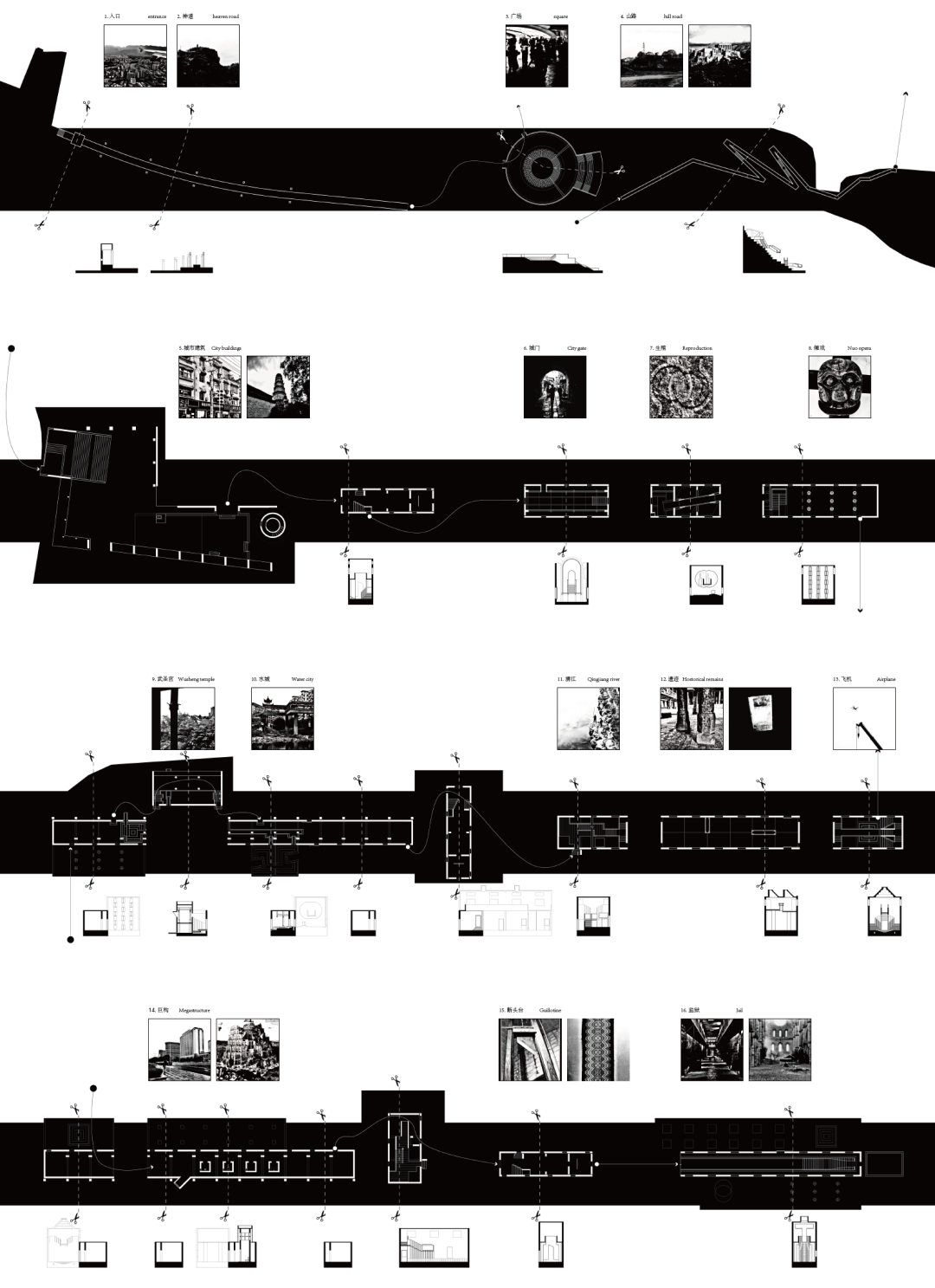 恩施第一监狱位于河流交汇处的岸边高地,废弃的建筑成为一处遗置的废墟。更新设计完整保存其外部形态和废墟气质,将其内部改造成为固定展演土家族民族史诗的沉浸式剧场。两个方案分别选取长篇民族史诗《梯玛歌》和创世传说《摆手歌》为蓝本,将剧情结构转译为空间场景,形成阴阳交织、生死轮回的情节空间,最终实现从监狱到剧场、从戏剧到建筑的转译。两个方案将交由当地土家族社区选择实施。