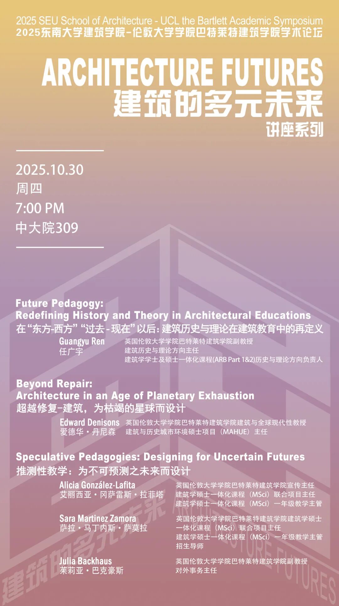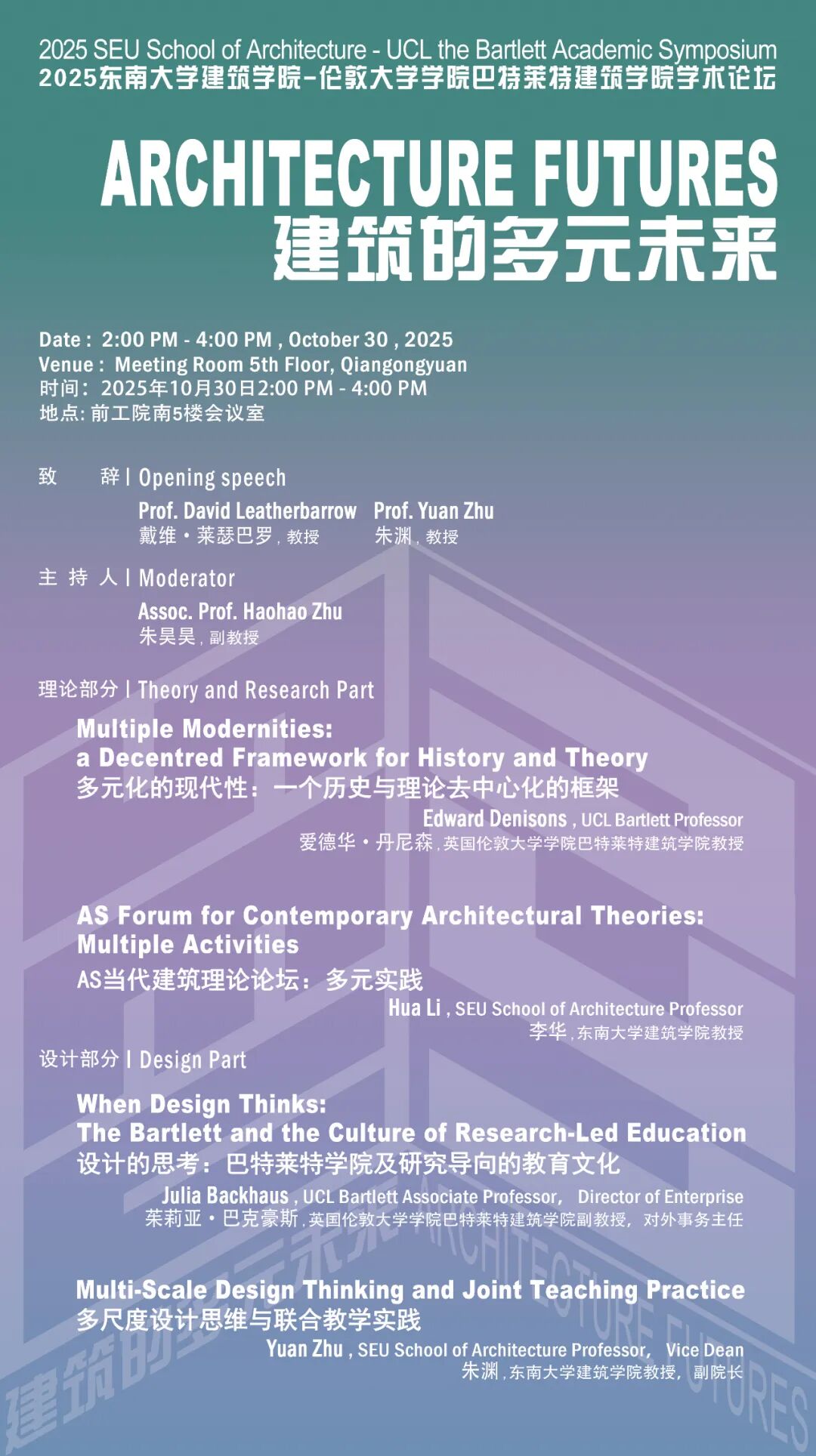 2025年10月30日至10月31日,英国伦敦大学学院巴特莱特建筑学院一行5人访问,并举办“—UCL巴特莱特建筑学院学术论坛”。该论坛以“建筑的多元未来”为主题,分为研讨会与公共讲座两部分,旨在通过国际学术交流,深化中英两校在建筑教育、研究与实践领域的合作与互鉴。论坛涵盖建筑历史与理论及设计教育与多尺度教学实践的前沿探索。